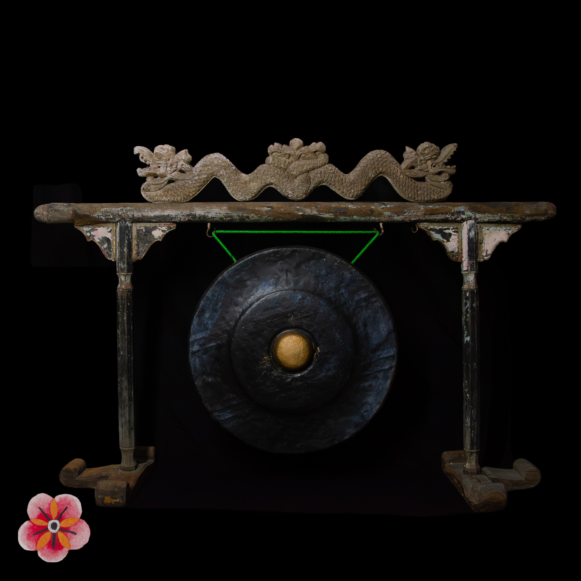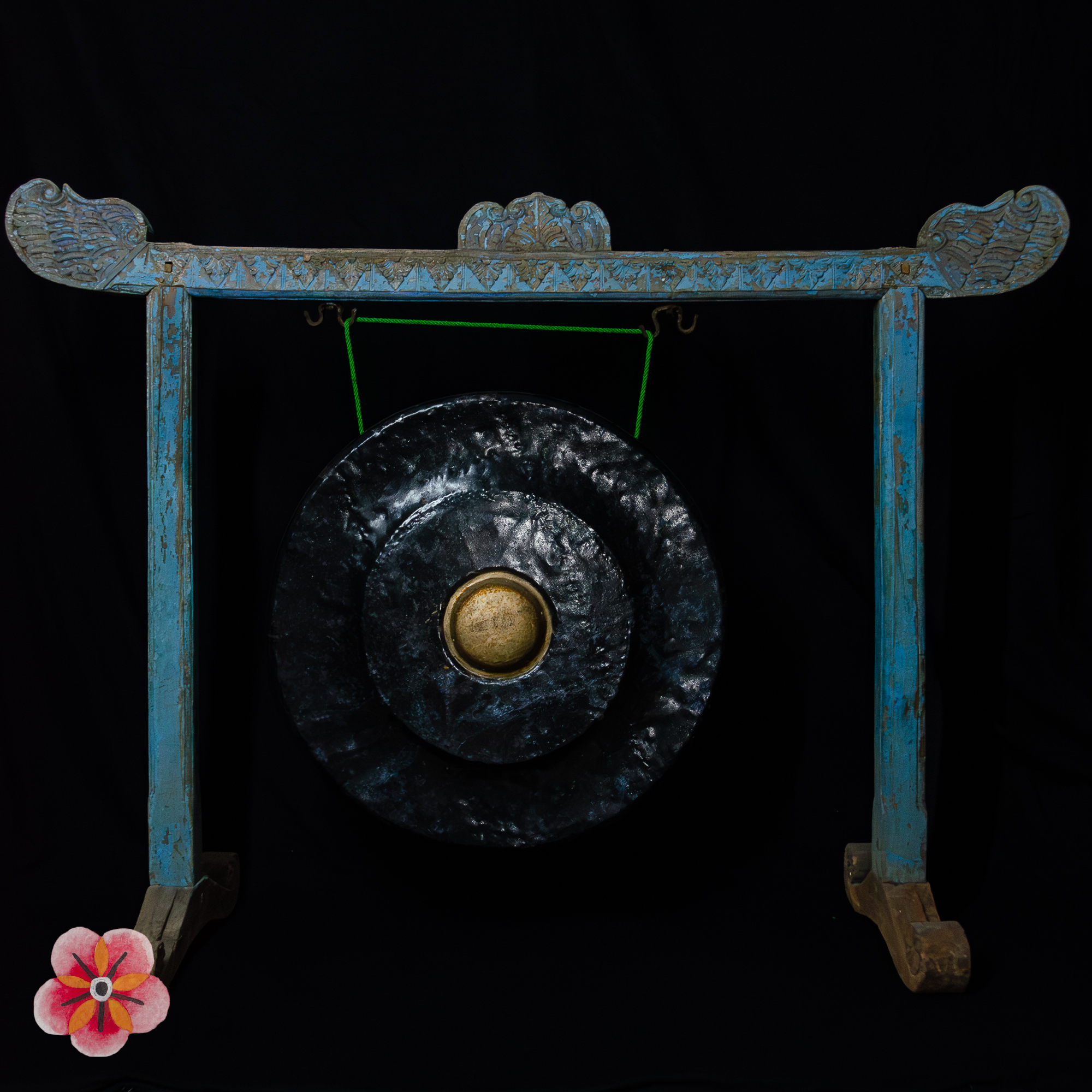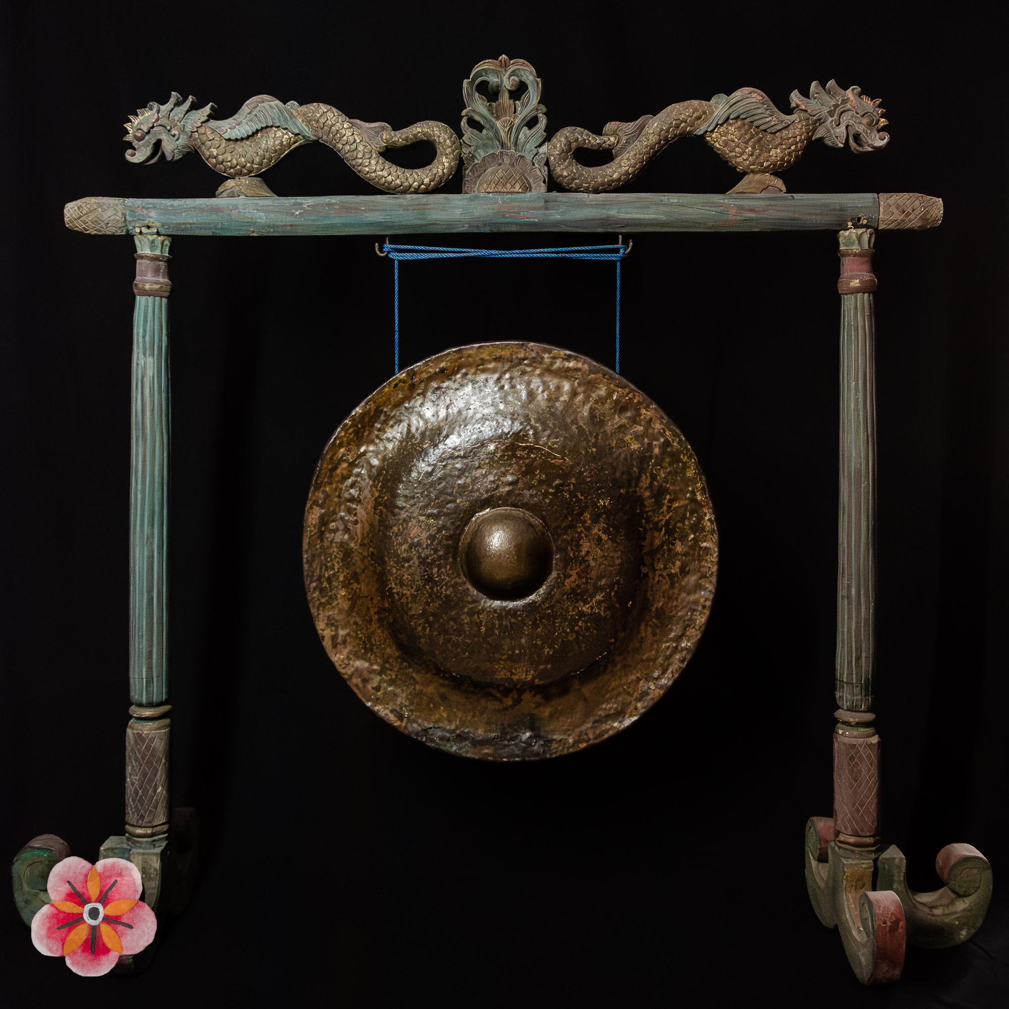What sets this gong apart is its rare blue polychrome color adorning the wooden support. The captivating blue hues infuse the artwork with an air of elegance and mystique, making it a truly unique and alluring piece.