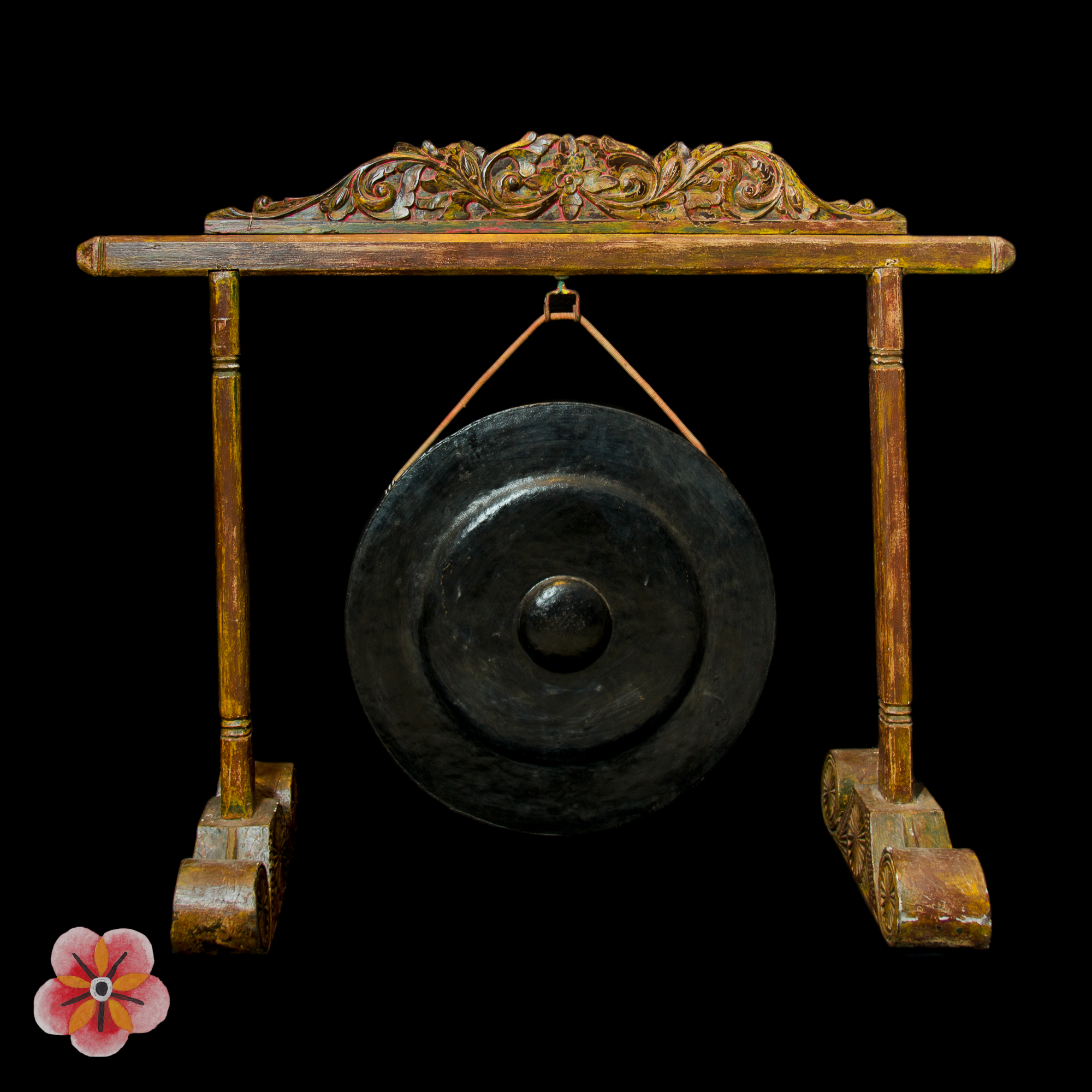 Step into the enchanting world of Madura Island with this extraordinary gong, a true testament to artistic brilliance and cultural significance. This exceptional musical instrument features a wooden support adorned with a captivating lotus flower in the center, surrounded by intricate floral and geometric reliefs on the upper part.