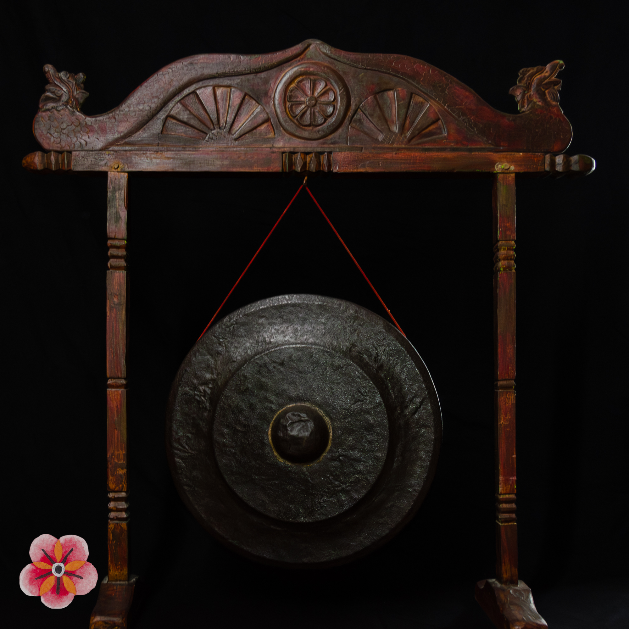 Handcrafted with teak, bronze alloy, and vibrant red polychrome, this gong epitomizes the skilled craftsmanship and artistic brilliance of Madura artisans. The dragons' bodies, resembling sinuous snakes, convey a sense of mystical power and grace, while the lotus flower symbolizes purity and spiritual growth.