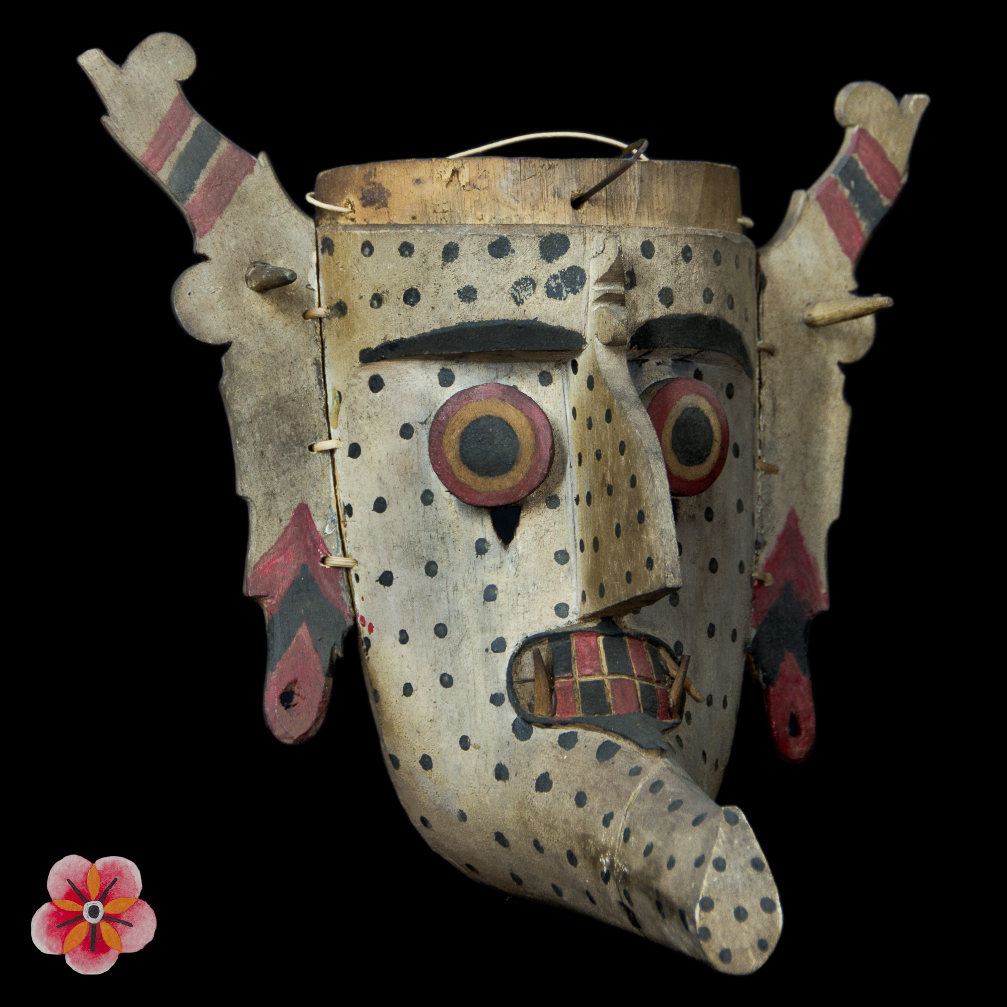 Meticulously carved from wood and adorned with polychrome detailing, this mask stands as a testament to intricate craftsmanship. Measuring 48 x 51 x 13 cm, it carries the cultural legacy of propitiatory dances before planting, symbolizing protection and blessings for rice plants.