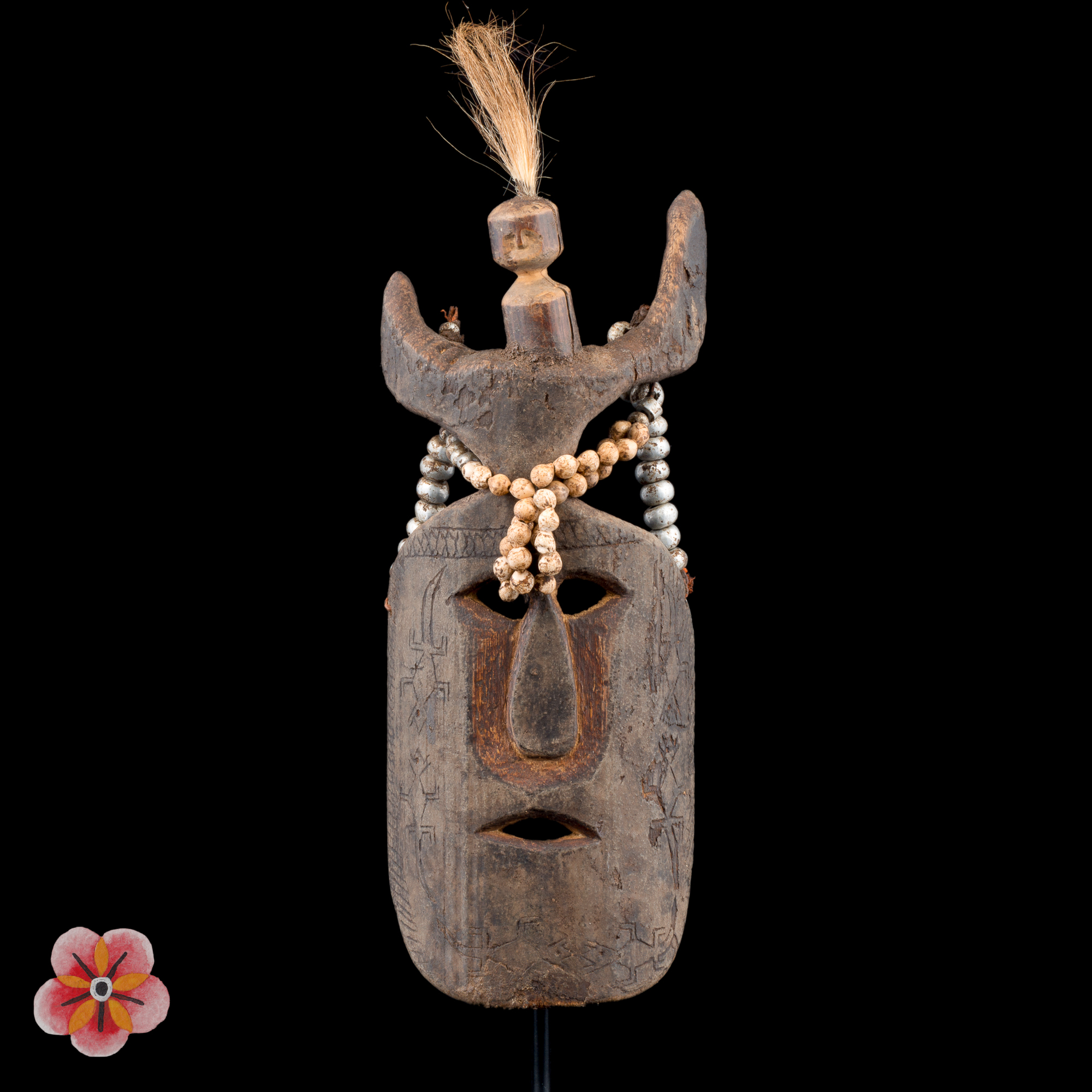Discover the captivating world of West Timor's Oinlasi area through this remarkable ritual mask. Crafted from wood and adorned with horsehairs, seeds, aluminium, and a mesmerizing patina, this mask stands at 37 × 11 × 9 cm, radiating a powerful presence.