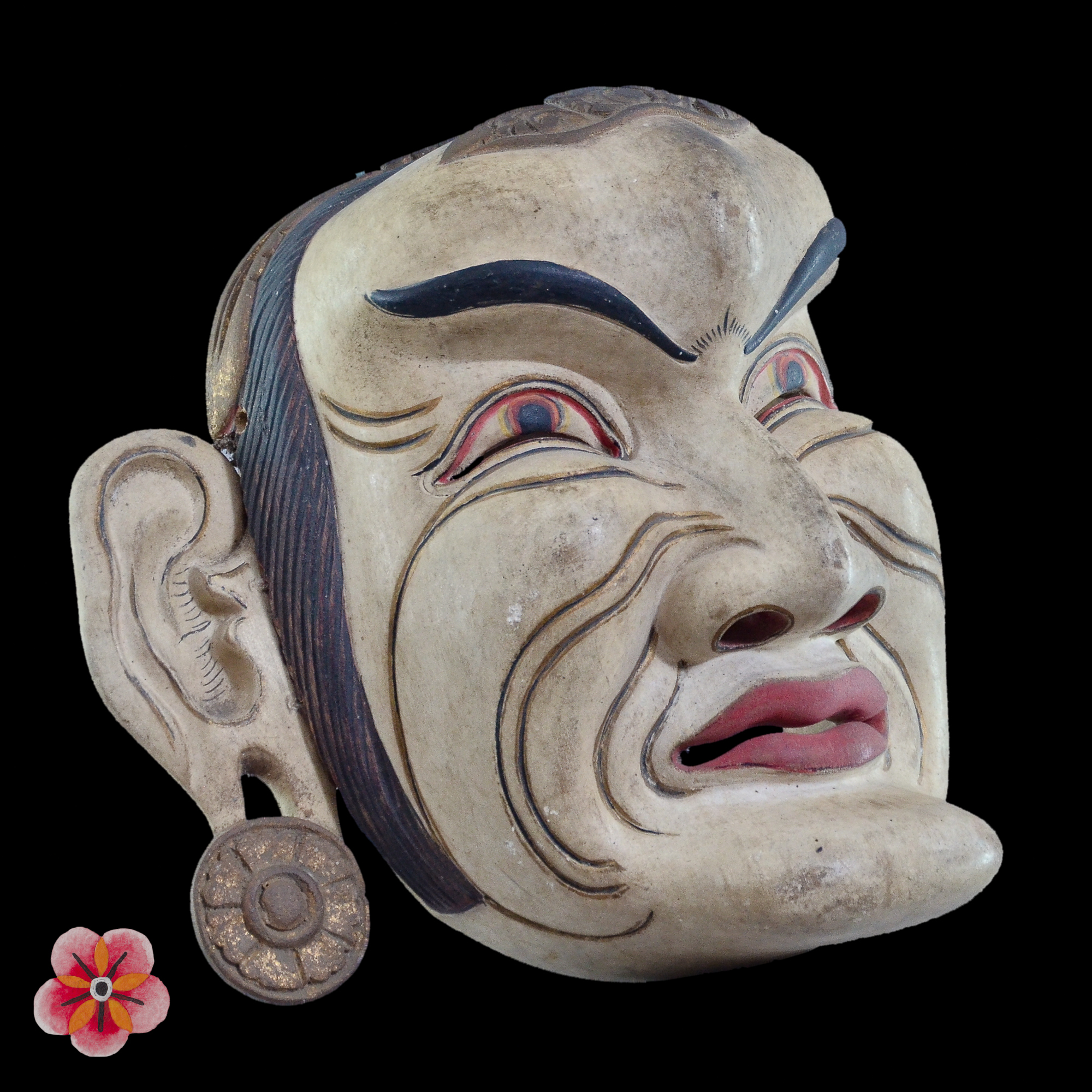 The beauty of this mask lies not only in its strong and expressive features, which align perfectly with its revered role, but also in the special charisma it possesses. The master mask maker who crafted this work imbued it with a unique essence known as "taksu." Taksu is an intangible quality recognized in the creations of great artists, bestowing upon their works a profound presence that goes beyond mere aesthetics.