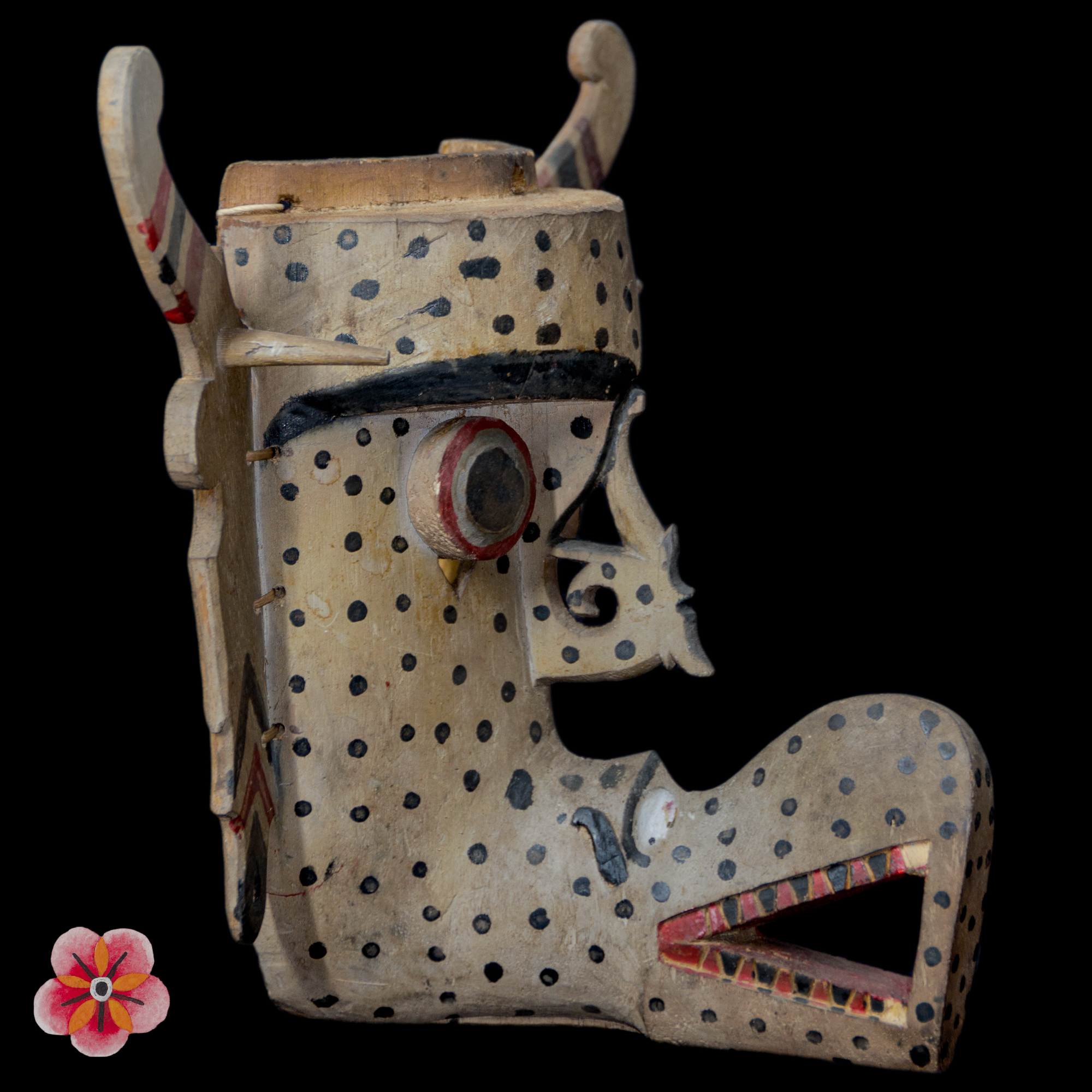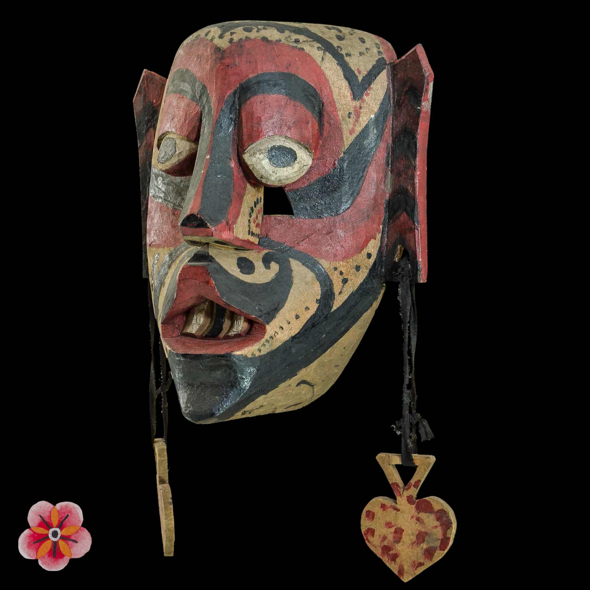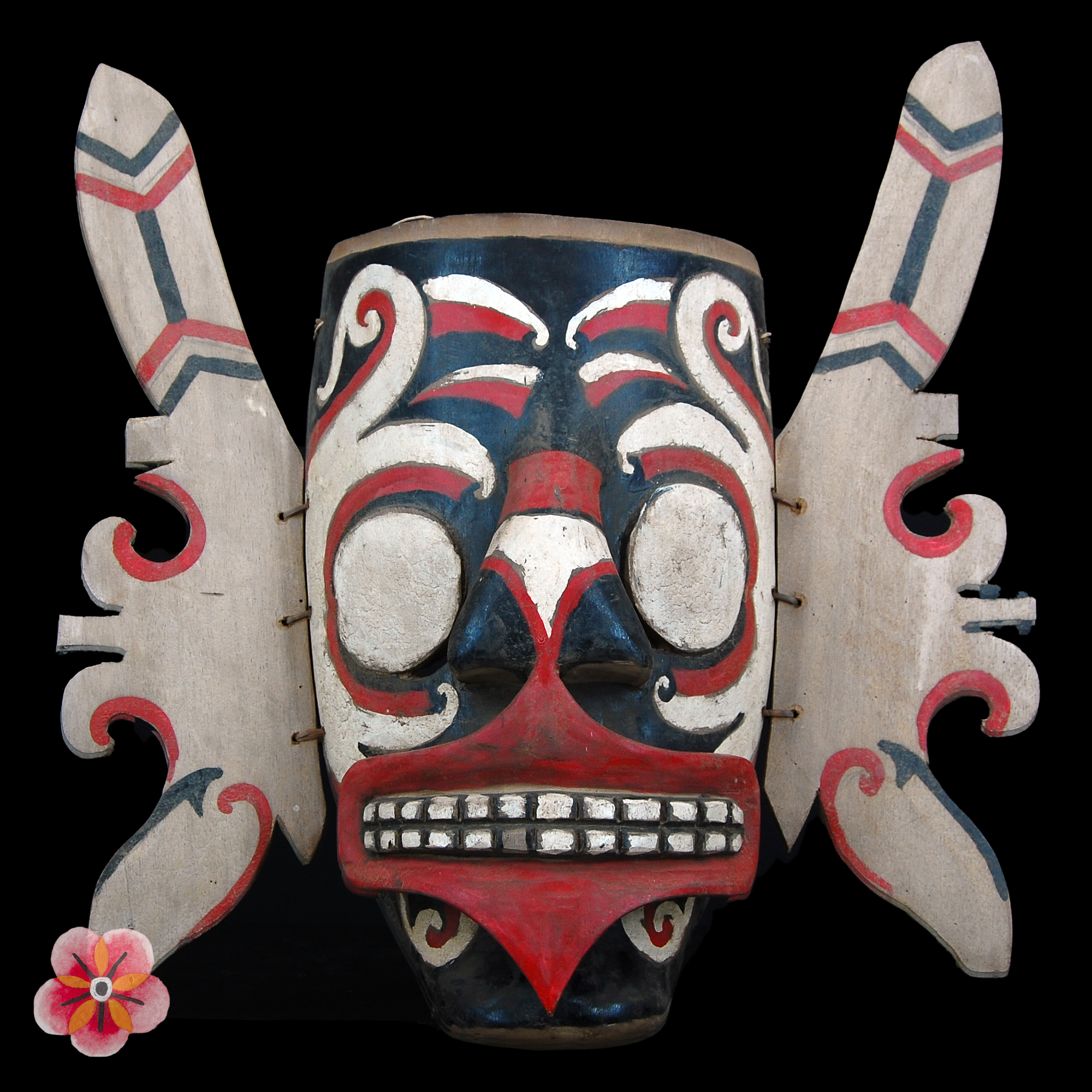 Notably, the mask's striking feature lies in its mouth, meticulously shaped to resemble the mythical aso', the revered "dog-dragon" protector. This powerful symbol holds great significance in the Dayak cosmology, embodying the strength and potency required to guard against malevolent forces and promote abundance and well-being.