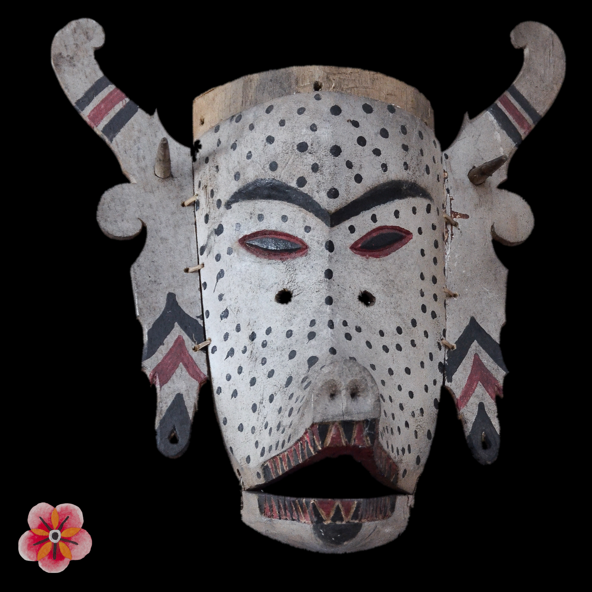 Meticulously carved from wood and adorned with polychrome detailing, this mask stands as a testament to intricate craftsmanship. Measuring 48 x 51 x 13 cm, it carries the cultural legacy of propitiatory dances before planting, symbolizing protection and blessings for rice plants.