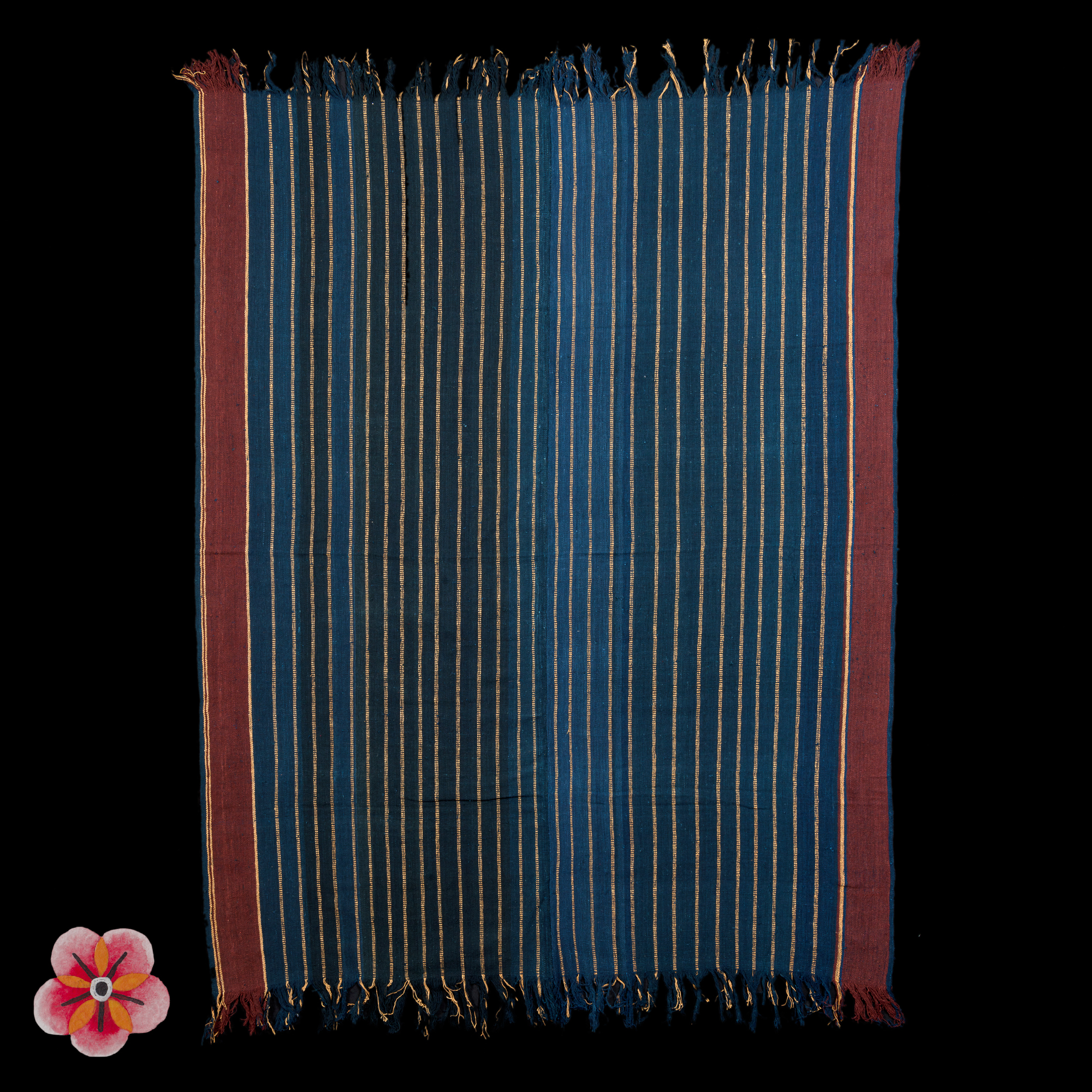 This remarkable Selimut ceremonial blanket hails from Timor Island, specifically from the region of West Insana, Subun. Measuring 226 × 110 cm, this exquisite three-panel blanket is meticulously handcrafted from handspun cotton and adorned with natural dyes, showcasing a captivating color scheme of dark indigo with intricate white patterns. The Selimut's design features a wide middle centerfield in plain dark indigo, flanked by side panels displaying scores of narrow stripes and fine intricate white patterns on an indigo background—a characteristic style of the Insana region.