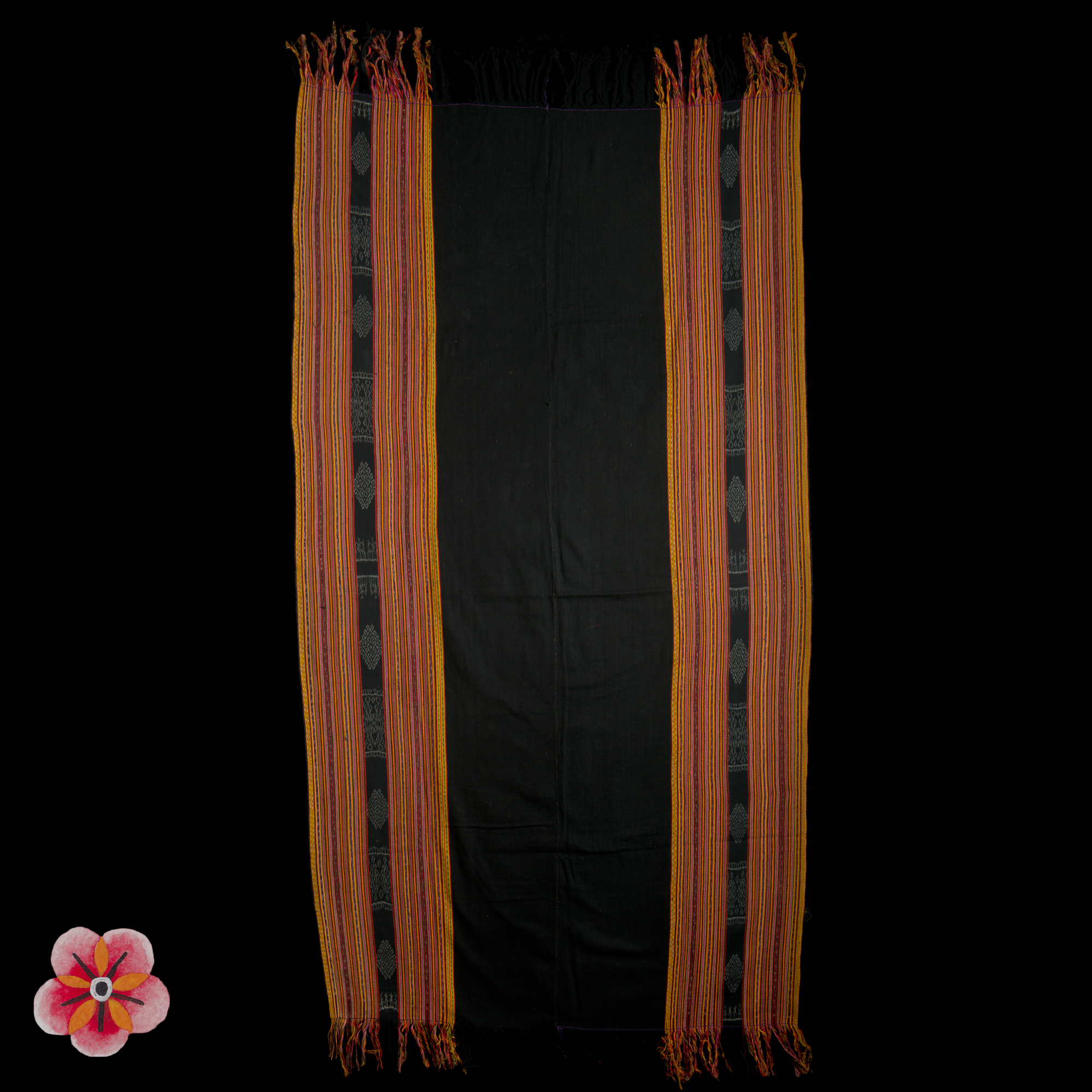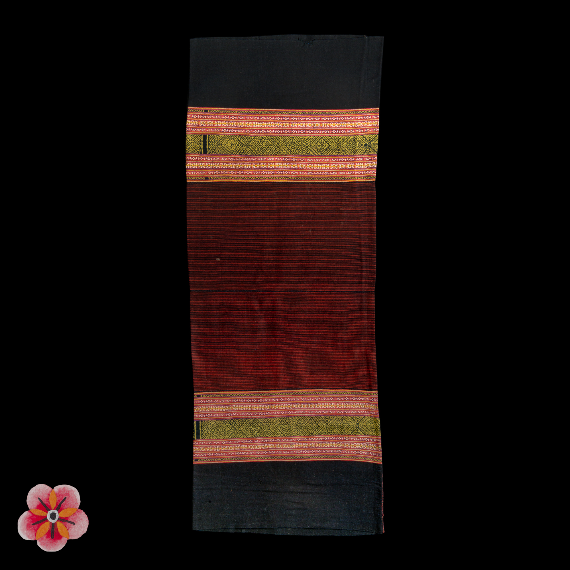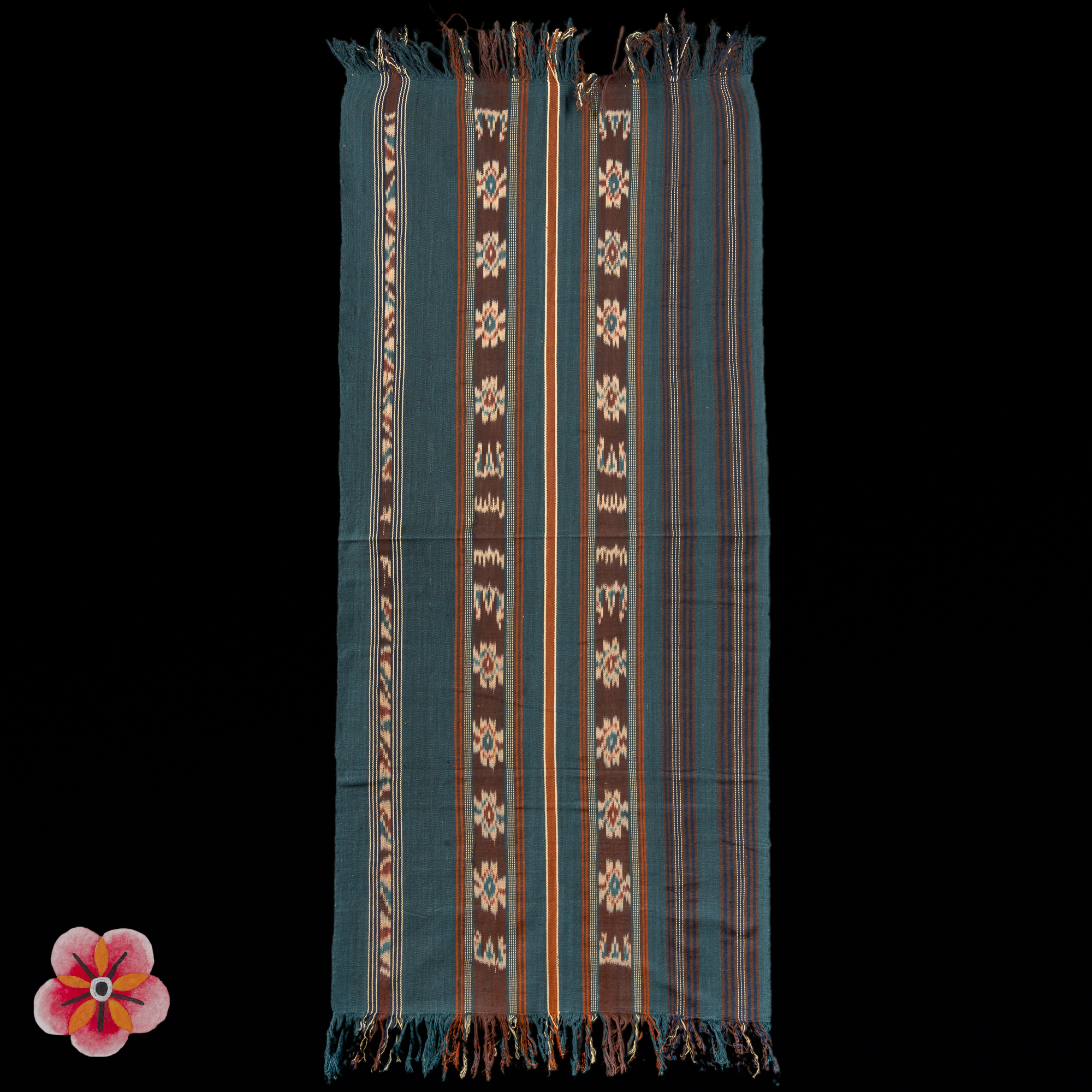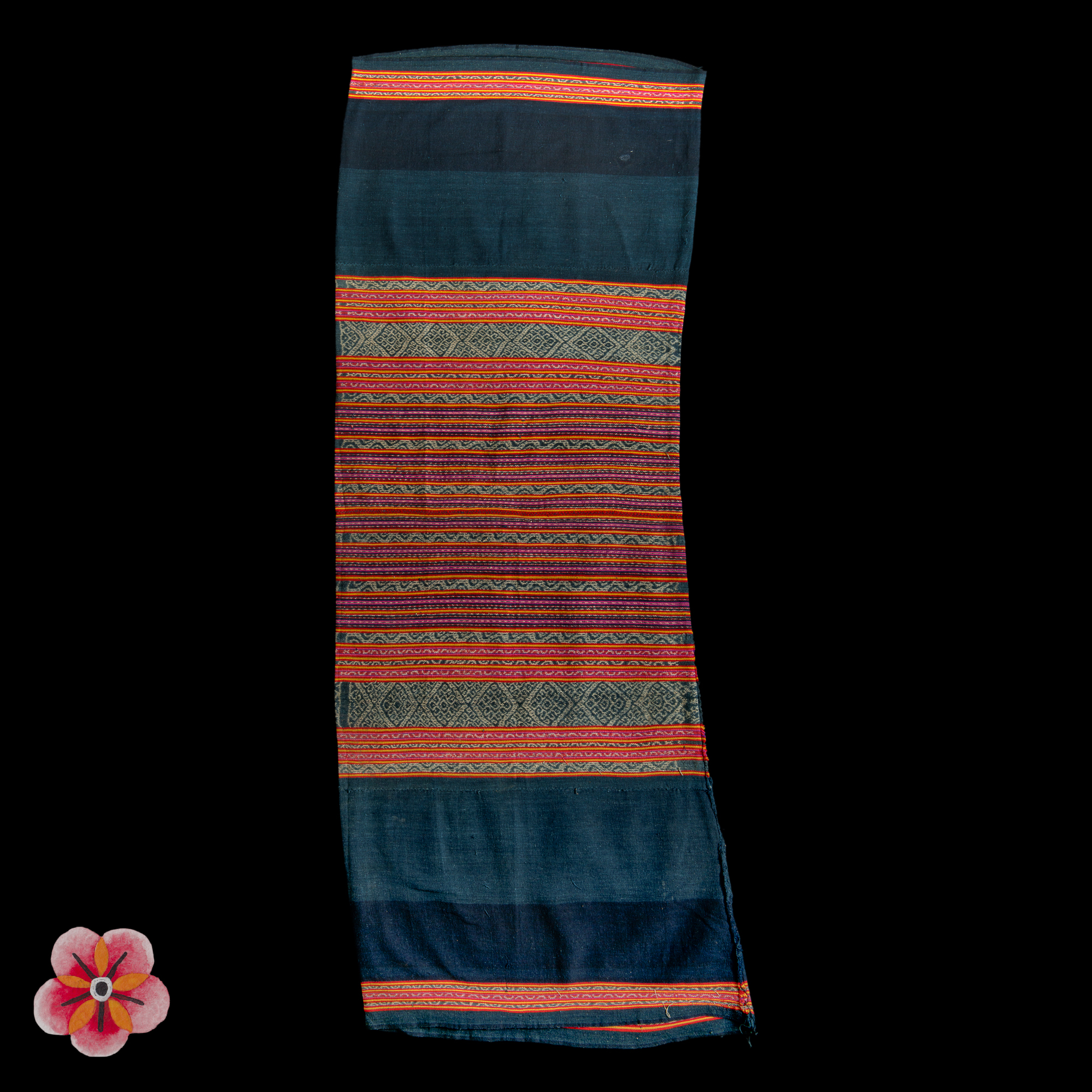 This exquisite Èi, or sarung for women, originates from Savu Island and is a rare example from the Great Blossom (hubi ae) society—a matrilineal lineage group within the Savunese People. Measuring 145 × 59 cm, the handspun cotton fabric is adorned with natural dyes, featuring the traditional colors of white cotton, blue-black from indigo leaves, and red from the roots of the Morinda tree.