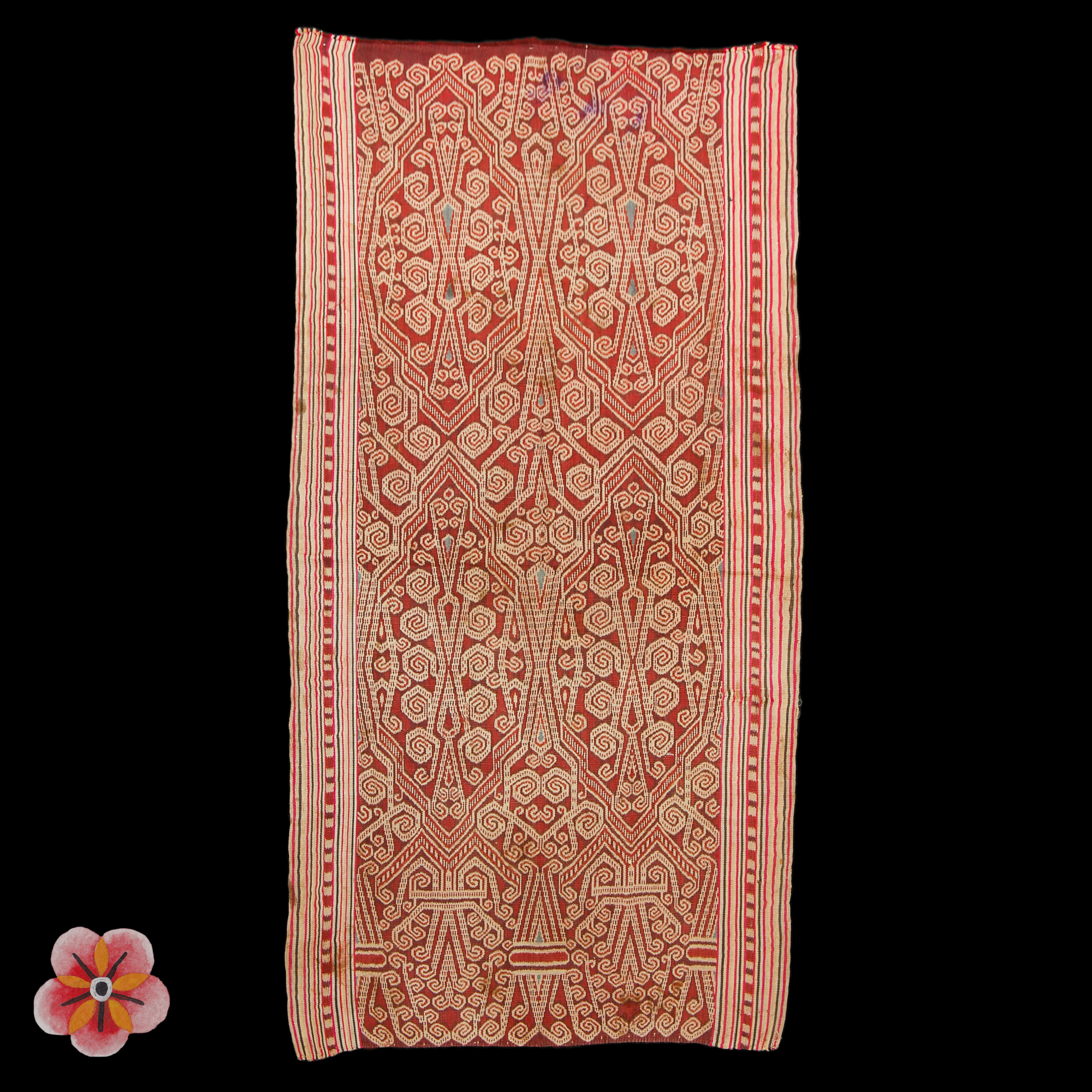This extraordinary Pua' Kumbu' originates from the heart of West Borneo and bears witness to the profound spiritual and ceremonial significance of the Iban Dayak culture. Measuring 107 × 198 cm, the ceremonial textile is crafted from hand-spun cotton and adorned with rich, natural dyes in deep red earth tones, reflecting the beauty of nature's palette.